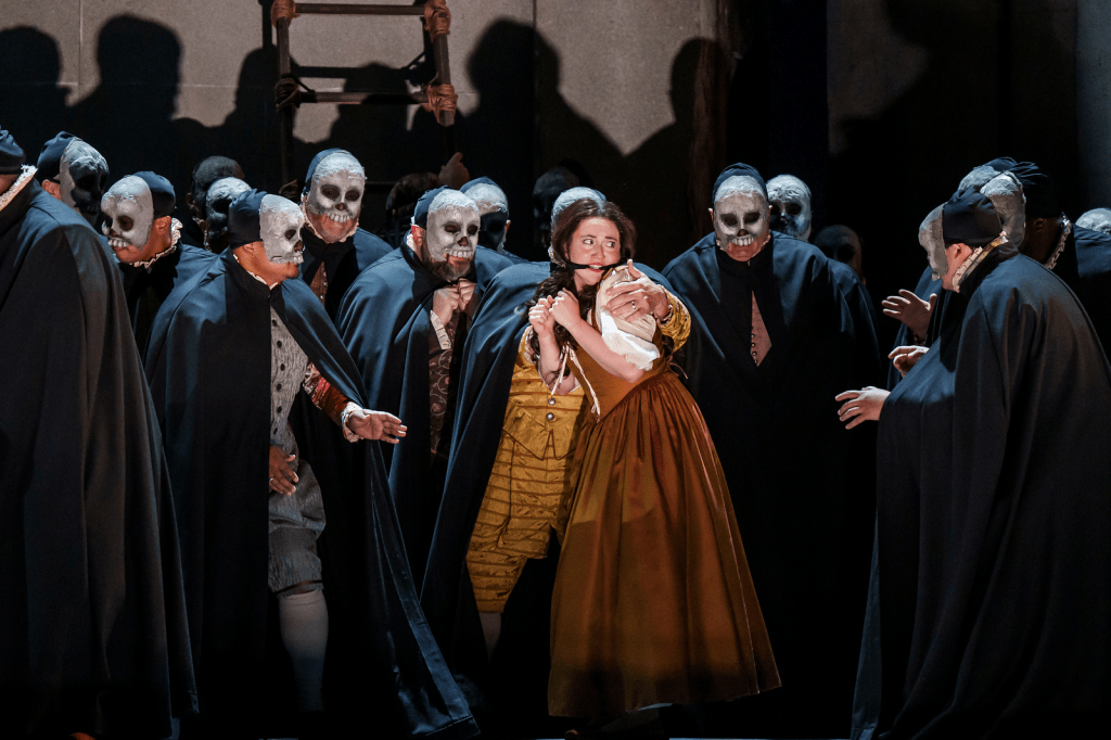 The tragic tone established at the beginning of the opera persists through the curses and the more serious romantic storyline from Gilda’s perspective. At the same time, the opera shifts between dark and festive moods, blending comedy with tragedy, lighthearted celebration with deep conflict. Gilda, a girl caught between the confinement imposed by her father (Rigoletto, portrayed by Russian baritone Igor Golovatenko) and her secret love for the Duke (Mexican tenor Javier Camarena), finds both worlds—home and romance—to be ultimately deceptive. Yet, this disillusionment does not diminish her love for either her father or her unfaithful lover.