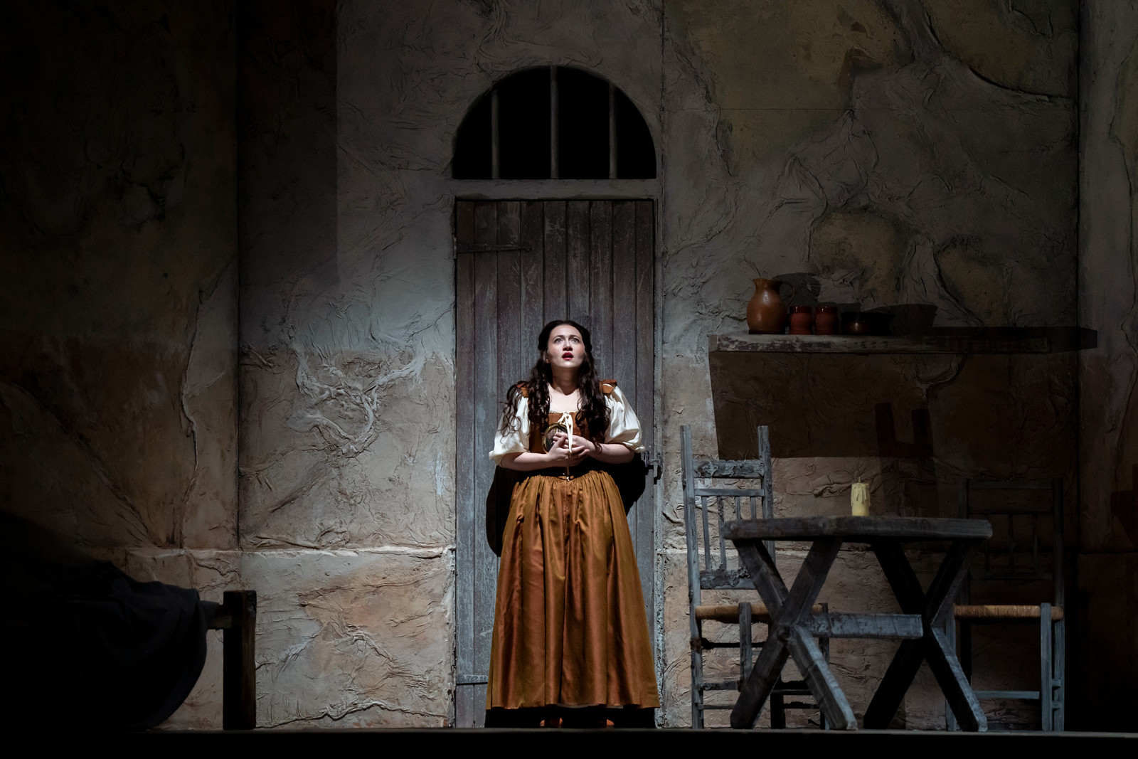 Mary Birnbaum, the director of this production, seeks to highlight the female characters in the opera and uses the overture to introduce Gilda (portrayed by Armenian soprano Mané Galoyan) in her modest room, reading the letters she has received from the Duke during their secret exchanges. This initial, contrasting scene is not mentioned in the program’s summary of the opera. It also creates a ring composition with the ending: while Gilda is reading the letters, a mysterious female figure appears at the back of the room, beyond an open door. Gilda, startled for a moment, becomes aware of the unexpected presence. This scene during the overture foreshadows the transcendent moment at the end when Gilda’s spirit is welcomed and guided by her mother. The ghostly appearance at the beginning also complements the tragic tone of the overture.